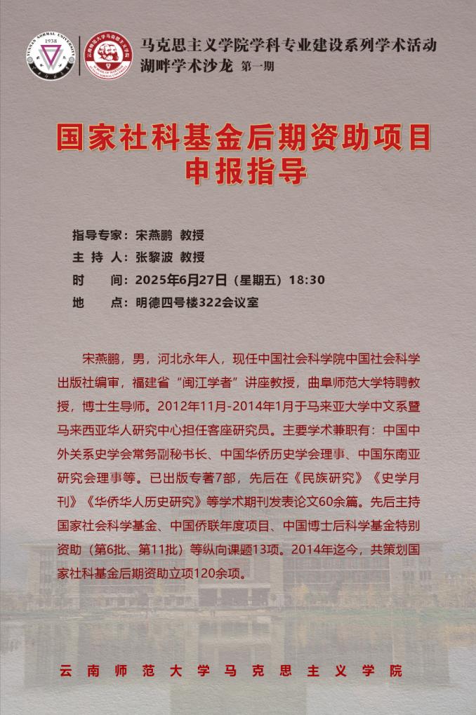 2025年6月27日晚,z6mg人生就是博官网学科专业建设系列学术活动“湖畔学术沙龙”第一期成功举办。特邀中国社会科学出版社编审宋燕鹏教授,一对一指导国家社科基金后期资助项目申报。学术沙龙由z6mg人生就是博官网经理张黎波教授主持,公司拟申报国社科后期资助项目的10余名教师参加。