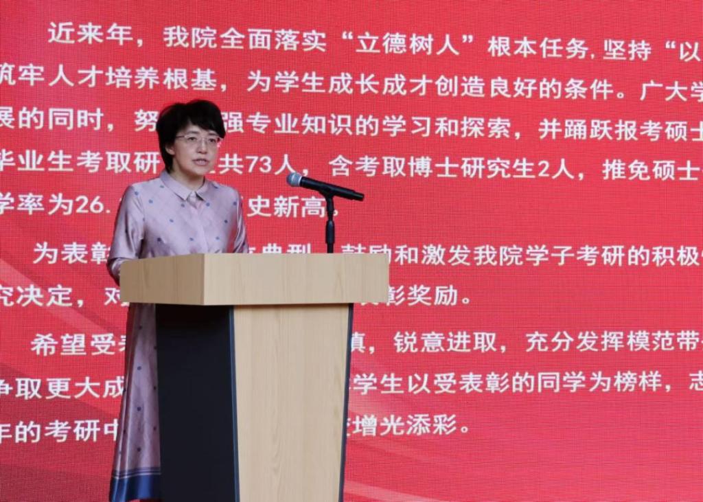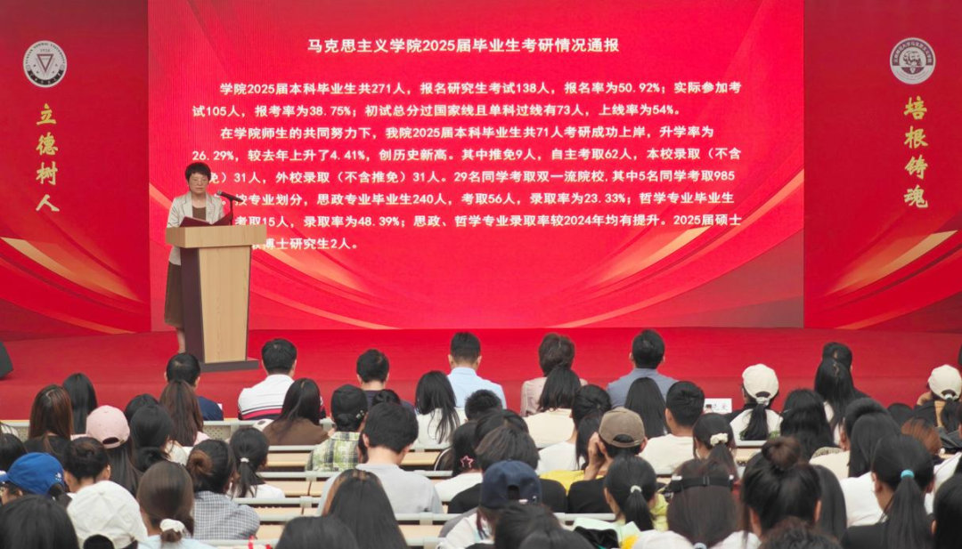 会上,双晓爱副经理通报了公司2025届毕业生考研情况,指出在公司师生共同努力下,公司2025届毕业生共73人成功上岸,其中,71名本科毕业生成功考取硕士研究生,升学率为26.29%,较去年上升了4.41%,2名硕士研究生成功考取博士研究生,创历史新高。